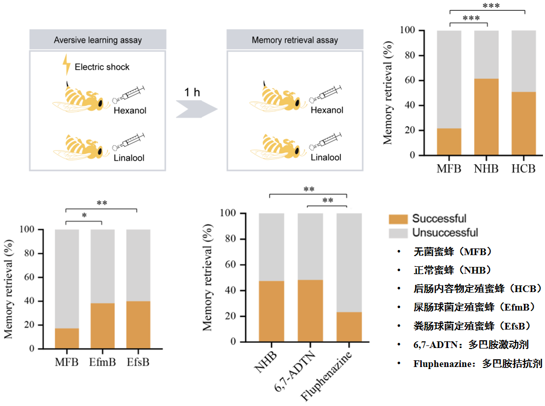 蜜蜂是全球生态与农业系统的核心传粉者之一,约90%以上的主要农作物依赖其授粉,其防御行为直接维系着蜂群的安全与稳定。蜜蜂在遭遇天敌时会蜇刺攻击并释放报警信息素召唤同伴,且能通过被天敌攻击的负面经历形成“厌恶性记忆”,在未来遇到相似危险时主动规避或迅速开启防御。前人研究表明,肠道菌群能够通过调控神经系统影响宿主的多种行为,但肠道菌群是否参与调控蜜蜂在防御过程中形成的厌恶性学习与记忆能力?其中涉及的分子神经机制是什么?目前尚不清楚。