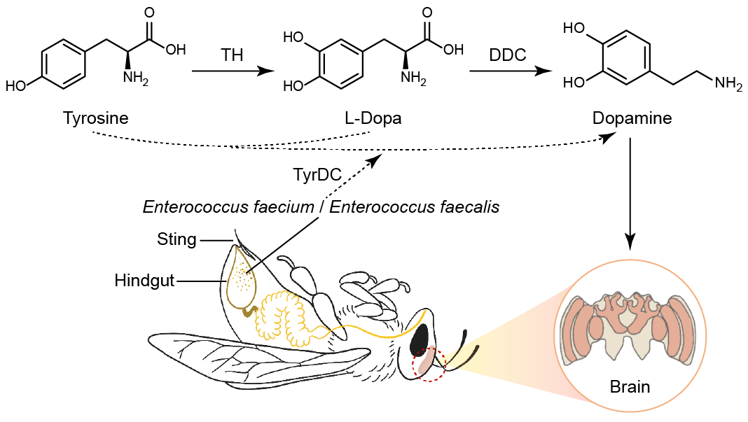 中国科学院生态环境研究中心葛源研究组联合中国农业科学院蜜蜂研究所揭示了肠道菌群参与调控蜜蜂的厌恶性学习记忆,进而改变蜜蜂习得性防御行为的新机制,相关成果近期发表于《自然·通讯》(Nature Communications)上。蜜蜂是全球生态与农业系统的核心传粉者之一,约90%以上的主要农作物依赖其授粉,其防御行为直接维系着蜂群的安全与稳定。蜜蜂在遭遇天敌时会蜇刺攻击并释放报警信息素召唤同伴,且能通过被天敌攻击的负面经历形成“厌恶性记忆”,在未来遇到相似危险时主动规避或迅速开启防御。前人研究表明,肠道菌群能够通过调控神经系统影响宿主的多种行为,但肠道菌群是否参与调控蜜蜂在防御过程中形成的厌恶性学习与记忆能力?其中涉及的分子神经机制是什么?目前尚不清楚。该研究综合行为学、代谢组学、无菌蜜蜂模型构建及单菌定殖等多项实验技术,发现肠道菌群可通过调节蜜蜂肠道、血淋巴和大脑中的多巴胺水平,进而调控蜜蜂在防御行为中的厌恶性学习与记忆能力,阐明了“肠-脑轴”在蜜蜂防御行为中的作用机制(图1)。该研究通过在超净环境下建立无菌蜜蜂模型,发现移除肠道菌群会导致蜜蜂厌恶性学习记忆能力下降30%;代谢组学分析表明,无菌蜜蜂体内的多巴胺水平同步显著降低;进一步的单菌定殖实验证实,蜜蜂肠道中的肠球菌能通过合成多巴胺,恢复蜜蜂的学习记忆与防御能力,阻断该通路则会重现认知缺陷与行为失调(图2)。该研究从“One Health”的视角认识肠道菌群如何通过“肠-脑轴”调控蜜蜂的社会行为,为通过调控菌群促进蜂群稳定和生态功能提供了新思路。图1. 肠道菌群通过“肠-脑轴”调控蜜蜂厌恶性学习记忆的机制图2. 肠道菌群通过多巴胺代谢调控蜜蜂的习得性防御行为上述研究得到中国农业科学院科技创新工程和中国科学院区域与城市生态安全全国重点实验室资助,蜜蜂研究所博士生封王江、张丽副研究员、生态环境研究中心博士生李静为共同第一作者,葛源研究员与刘永军研究员为共同通讯作者。论文链接:https://www.nature.com/articles/s41467-025-67586-8土壤环境科学与技术实验室区域与城市生态安全全国重点实验室2026年1月1日<!--!doctype-->