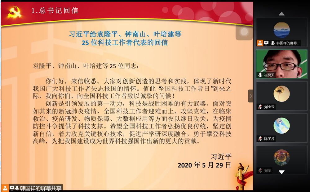 5月29日,在我国第四个全国科技工作者日前夕,习近平总书记给袁隆平、钟南山、叶培建等25位科技工作者代表回信,向他们和全国科技工作者致以诚挚的问候。为了深入贯彻落实回信精神,践行新时代科技工作者的使命和担当,5月31日晚19:00,生态环境研究中心研究生会召开了“学习总书记回信精神”的线上会议。此次会议有来自研究生会各个部门的20余名同学积极参与。