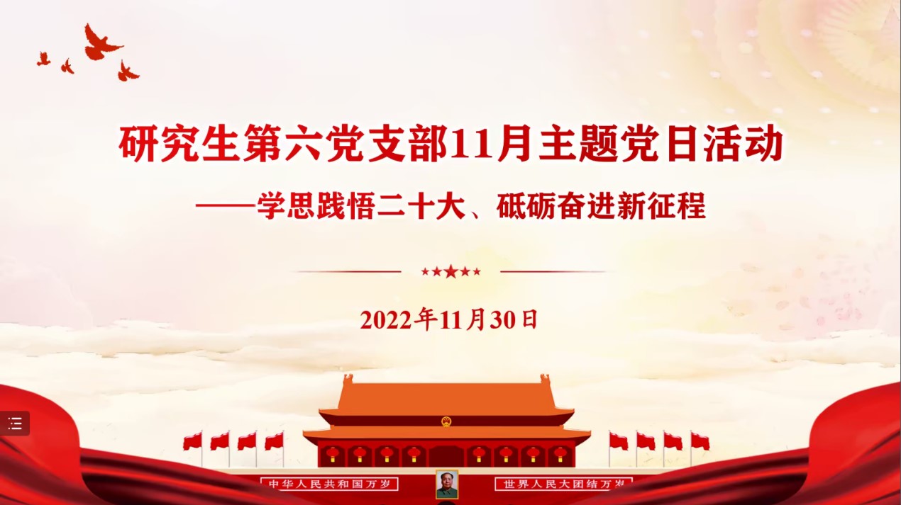 11月30日,研究生第六党支部召开“学思践悟二十大、砥砺奋进新征程”主题党日活动,会议由支部书记王莹主持。