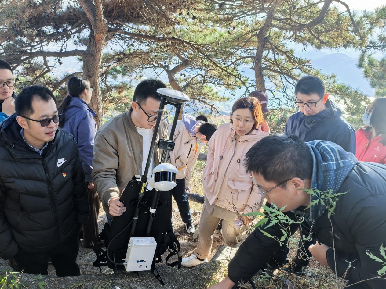 参加主题党日活动的各位同志首先登上了平台所在的五观台,参观了蟒山观测平台的大气污染观测系统、气象观测系统、二次气溶胶在线监测系统、气传致敏花粉、大气干湿沉降系统;并俯瞰北京城市全景,对城区和远郊区域的光化学污染差异进行现场观察比对。随后,同志们前往蟒山油松、侧柏、辽东栎等植物长期样地,参观了每木植物生长监测系统、生物多样性自动化观测装置、碳通量观测塔,并现场利用树木径向生长仪、植物蒸腾耗水监测系统、背包便携式激光雷达、新一代光合-荧光全自动测量系统等设备开展了植被样地多样化的实地监测。最后,全体参与人员在邓小平同志植树处合影留念。