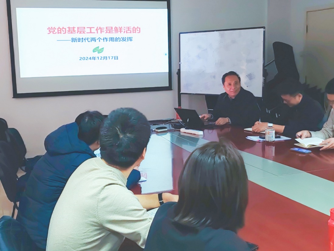 会议邀请中心党委副书记、纪委书记占剑作了题为“党的基层工作是鲜活的——新时代两个作用的发挥”的报告。报告分三个部分内容,在“新时代新形势”部分,以“时势造英雄”为切入点,提出党员同志应如何正确认知所处环境,精准洞察时代大势,巧妙借助良好时势为党的基层工作创造有利条件,鼓励党员们紧跟时代步伐,勇立潮头;在强调党支部的战斗堡垒作用时,提出“团结是力量”,强调党支部要高度重视组织力量的凝聚,通过加强内部协作与沟通,打造坚不可摧的战斗集体,高效推进基层工作,为实现党的目标任务筑牢坚实根基;在聚焦党员的先锋模范作用中,倡导“英雄当自强”,激励党员同志以自强不息的精神严格要求自己,在工作与生活中时刻以身作则,勇于担当作为,积极发挥先锋引领作用,成为广大群众的榜样与旗帜。占书记的报告内容详实、条理清晰、深入浅出,引发了党员们的强烈共鸣与深入思考,使大家对党的基层工作有了更为深刻、全面的认识与理解,进一步明确了自身在新时代党建工作中的责任与使命。