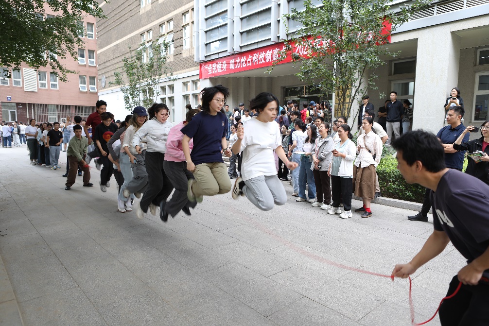 集体跳绳展示的赛场上,随着裁判员一声哨响,长绳在空中划出优美的弧线,摇绳队员全神贯注,控制节奏;跳绳队员身轻如燕,配合默契。赛场边,加油声、计数声、欢笑声此起彼伏,展现了科研工作者们脱下白大褂、走出实验室后充满活力与激情的一面。比赛不仅是速度与技巧的较量,更是团队协作精神的集中体现。