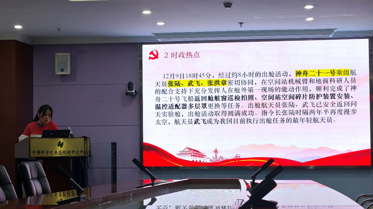 随后,会议组织开展时政热点集中学习,重点围绕近期国内外重大事件和发展成就进行学习。在科技创新领域,重点学习了神舟二十一号航天员成功完成出舱任务的相关情况,充分感受到我国航天事业不断迈向新高度的综合实力和科技自信;在经济发展方面,重点学习了宁波舟山港集装箱吞吐量再创新高、山东省GDP突破十万亿元和海南封关对我国对外开放的影响等内容,深刻感受我国经济发展韧性强、潜力足、动能稳的良好态势。