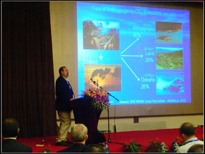 生态环境研究中心副主任江桂斌在开幕式上致辞,美国田纳西大学-橡树岭国家实验室生物科学联合研究所主任Gary Sayler介绍了中美联合研究中心的概况。中国科学院地理科学与资源研究所研究员李胜功,田纳西大学教授Barry Bruce,生态环境中心研究员潘纲做了大会主题报告。60多位科学家做了分会场报告,针对“微生物生态和科技”、“生态系统碳氮循环”、“可再生能源和减排”、“环境变化与健康”四个专题进行了报告、讨论与交流合作。
