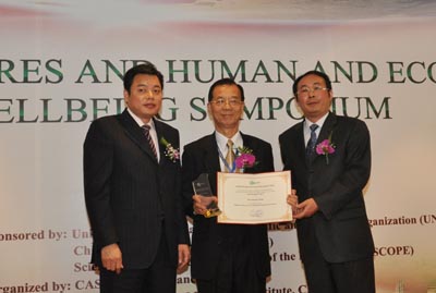 吕永龙和单晓昌为Bedrich Moldan教授颁发“SCOPE-ZHONGYU环境成就奖”