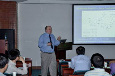 蓝藻栖息于世界各地的地表水。由于可产生蓝藻毒素,蓝藻的过度生长造成水质恶化。这些蓝藻毒素一般包括一系列的毒素。其中的微囊藻毒素与世界范围内蓝藻爆发引起的人口死亡相关,但对相关的分子机理研究极为有限。Charles Holmes博士研究了微囊藻毒素与磷酸酶的相互作用,揭示了其肝毒性的分子作用机理,并利用他们在分子作用机理研究中的发现,发展了可监测饮用水中微囊藻毒素的新技术新方法。Charles Holmes博士精彩的演讲获得了热烈的掌声,激起了热情的讨论和提问。