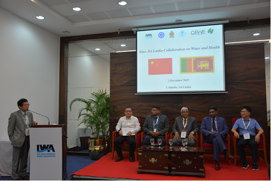 在水与发展大会上,中心与联盟一起设置了与企业展区连成一片的中国展区,重点宣传了中国科学院-发展中国家科学院水与环境卓越中心(CEWE)、中斯水科技合作、水专项饮用水主题的取得的系列成果,展示了部分联盟企业的主打产品,引起了广泛的关注。中心还与斯里兰卡供排水委员会共同组织召开了“中-斯水与健康合作论坛”。在论坛上,杨敏介绍了CEWE近年来在推动一带一路水科技合作方面的思路与进展,魏源送研究员以及斯供排水委员会Weragoda博士、斯卫生部Asanga博士等围绕2015年中斯政府间协议签署以来双方在不明原因肾病以及饮用水安全保障领域从事的合作成果进行了汇报。一带一路环境科技联盟、UNDP斯里兰卡代表处、以及部分企业代表也先后做了分论坛报告。论坛还邀请了国际水协会执行主席Kala Vairavamoorthy教授、IWA WDCE 2019大会主席Thilina S.Wijetunge先生、中国环境科学研究院吴丰昌院士、广东省微生物研究所吴清平院士等专家参与圆桌讨论,为中斯合作项目建言献策。整个论坛会场座无虚席,气氛热烈,为今后中斯双方深入开展不明原因慢性肾病(CKDu)追因项目研究起到了有力推动。