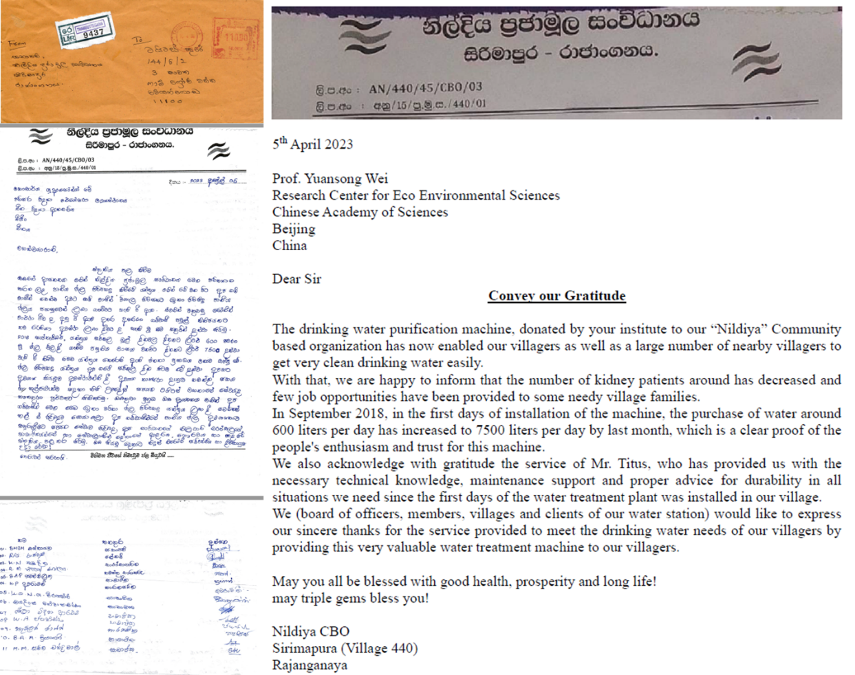 图2. 2023年4月Nildiya社区村民感谢信(僧伽罗语)及其英文翻译件