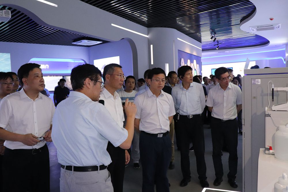 杨敏引导盐城市调研组参观了基地展厅、中试大厅和实验室,并对盐城基地的建设进展、目标定位、未来发展方向与计划做了系统介绍。戴源书记对盐城基地的建设、定位、功能给予了充分的肯定,并期待生态环境中心的入驻能为盐城环保产业注入新的动力。