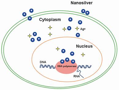 本研究证实纳米银可通过“木马”(“Trojan horse”)效应将银带入细胞,细胞内同时存在纳米颗粒和银离子,纳米银可直接与RNA聚合酶结合,通过“颗粒效应”抑制基因转录。这项研究工作对揭示纳米银抗菌和产生细胞毒性的分子机制具有重要学术价值。