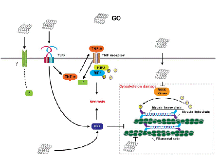 研究人员发现,GO可通过激活TLR4受体诱发细胞肿瘤坏死因子(TNF-α)的自分泌。TNF-α可作用于其细胞膜表面的TNF-α受体,使其下游的受体相互作用蛋白1(RIP1)和3(RIP3)磷酸化,进一步诱导细胞的程序性坏死。在此过程中,GO所诱导的活性氧(ROS)也促进了细胞的坏死过程。同时,GO可在巨噬细胞内大量累积,这可引发细胞骨架的塌陷和吞噬能力的抑制。Rho相关激酶(ROCK)在骨架动态平衡中起重要作用。而GO对细胞骨架的影响是通过抑制该激酶的活性实现的。这项研究工作对于揭示氧化石墨烯诱发的细胞死亡机制具有重要意义。