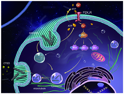 该研究组近年来一直致力于研究碳纳米管的细胞毒代动力学和热力学过程及其毒理机制。最近,将碳纳米管暴露巨噬细胞,通过检测胞外ATP的释放,意外发现一种特殊的嘌呤受体-P2X7参与介导了碳纳米管的外排过程。同时研究发现,过量的胞外ATP结合P2X7受体后,能短暂激活该受体,并诱导细胞外钙离子内流,进而激活MAPK信号通路。并且碳纳米管在溶酶体内的累积会引起溶酶体碱化,导致碳纳米管会沿着重排后的细胞骨架导轨排出细胞。该项研究首次揭示了细胞外排碳纳米管的分子起始事件以及后续的细胞生物效应。该研究将为碳纳米管未来的生物应用率和毒性防治提供指导价值。