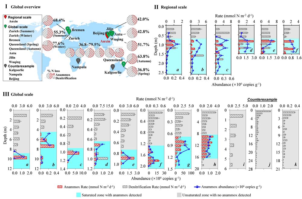 图1 (I)全球地下含水层规模性厌氧氨氧化的发生及对氮损失的贡献。饼形图表示厌氧氨氧化和反硝化过程对土壤中氮损失的贡献比率。(II)区域尺度旱地地下含水层厌氧氨氧化的发生、速率和贡献(24 km,中国河北省安新县)。a-f分别代表距离为7.0、7.0、4.0、4.5和1.5 km的不同土壤剖面。(III)全球地下土壤含水层厌氧氨氧化的发生,速率和贡献。速率用通量单位mmol N m-2 d-1表示,浅蓝色和灰色分别代表饱和和非饱和土壤层,速率和丰度数据均为平均值±s.e.(标准差,n = 5)。