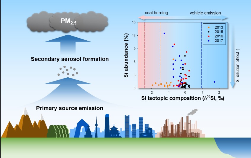 环境化学与生态毒理学国家重点实验室江桂斌组近年来在PM2.5的组分甄别及污染来源指示物方面开展了研究。在前期研究中,研究人员通过分析大量PM2.5及污染源样品的Si同位素组成,发现PM2.5的不同一次源具有显著不同的Si同位素指纹特征,证明了Si同位素指纹可以作为追溯PM2.5一次源的指示物,并进一步揭示了燃煤源是北京春冬季雾霾加重的重要原因(Environ. Sci. Technol.2018, 52, 1088-1095)。通过进一步研究,阐明了PM2.5二次生成过程中的硅稀释效应(Si-dilution effect),从而证明PM2.5的Si元素丰度可以作为PM2.5二次源的一种惰性指示物,并通过该方法发现2013年北京地区重雾霾时二次气溶胶贡献可达到79.2%(Atmos. Chem. Phys.2019, 19, 2861-2870)。