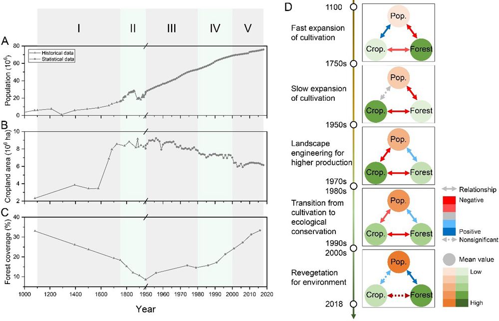 通过整合统计调查数据、历史时期重建数据和相关文献资料,该研究分析了黄土高原近千年来人口、耕地面积和森林覆盖率等要素的关系变化,将其社会-生态系统演变划分为5个阶段:“耕种快速扩张”(1100-1750年代)、“耕种持续扩张”(1750-1950年代)、“农田工程以增加粮食生产”(1950-1970年代)、“从粮食生产向生态保护转型”(1980-1990年代)、“植被恢复以保护生态环境”(2000年代至今)。研究还建立了黄土高原社会-生态系统状态与政策、气候、社会经济等驱动因素和本地粮食生产、黄河输沙量、径流量、三角洲面积、下游自然决堤次数等本地与溢出效应的经验联系。研究发现前三个阶段对粮食生产的追求破坏了当地生态环境,加剧了土壤侵蚀,对黄河下游和三角洲产生影响,而退耕还林还草等生态恢复和水土保持措施的实施减少了黄土高原土壤侵蚀和黄河泥沙,但同时也带来了径流减少、黄河三角洲蚀退等新的问题。