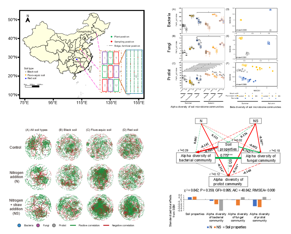 原生生物是土壤微生物组中的重要组成部分,处于食物网的中间营养级地位,通过食物网的交互作用直接或间接影响着土壤生物多样性及其生态系统功能。因受研究方法的影响,限制了对原生生物多样性及其功能的认识。课题组通过方法比较和摸索,采用高通量测序技术解析了我国3种典型旱地农田土壤(黑土、潮土和红壤)中的微生物组(细菌、真菌、原生生物)对不同施肥处理措施的响应。发现连续两年施氮肥处理对土壤细菌和真菌的alpha多样性和群落组成无显著影响,但显著降低了原生生物群落的alpha多样性并改变了其群落结构。同时,施氮肥处理显著降低了原生生物在微生物网络关系中的节点比例,使得土壤微生物互作网络关系更加紧密(图1)。