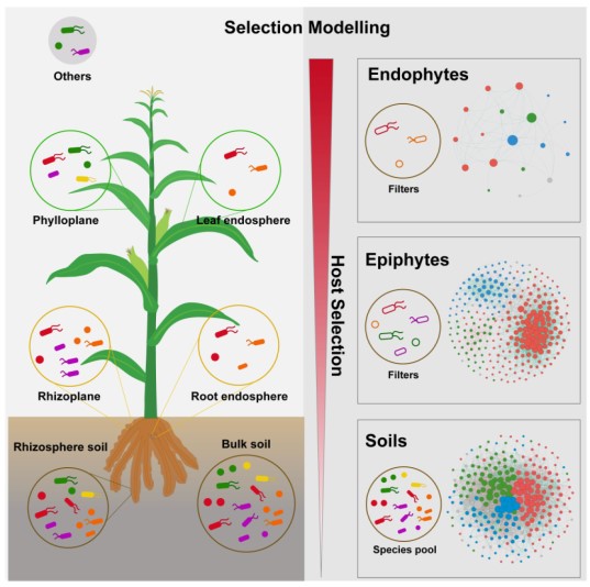 除土壤外,植物各个部位(如根、茎、叶等)也栖居着大量高度多样的微生物,构成植物的第二基因组,在促进植物养分吸收、维护植物健康和适应环境胁迫等起着重要作用。基于课题组在河南许昌(潮土)和云南曲靖(红壤)开展的旱地农田减氮增效长期定位试验,我们研究了玉米-小麦/大麦轮作下土壤及植物不同部位所代表的生态位中细菌和真菌的群落组成和构建机制。结果表明,在土壤-植物连续体上,细菌和真菌群落构建主要由宿主选择(即作物种类和生态位)决定,地域和地域所代表的土壤和气候因子,以及不同施肥措施仅对非根际土壤微生物群落有显著影响,对植物不同部位的微生物群落影响较小。溯源分析表明作物微生物组主要来自土壤环境并逐步被不同植物部位进行富集和过滤。从土壤到植物表面再到植物内部,宿主选择效应逐渐增加,环境效应逐渐减弱,同时,微生物多样性及网络复杂度相应降低(图2)。