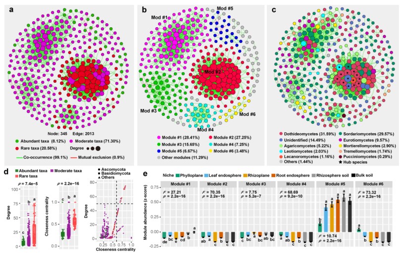 无论是土壤还是植物不同部位,细菌和真菌群落主要由少量优势类群主导(在每个样品中相对丰度≥1%的 ZOTUs),而其群落多样性主要由稀有物种(相对丰度<0.01%的ZOTUs)所代表。植物不同部位中,真菌群落的丰富物种主要由随机性过程主导,而稀有物种对宿主选择更敏感并且主要由确定性过程主导。此外,我们还发现真菌稀有物种在微生物网络互作及生态系统功能维持(如作物产量及土壤酶活)中发挥着重要作用。这些研究系统刻画了土壤-植物连续体上微生物的组成特征,揭示了宿主选择和环境效应对土壤和作物微生物组群落构建的相对贡献,以及稀有物种在维持微生物组稳定性及生态系统功能中的重要作用,丰富了宿主微生物组群落构建的生态进化理论,并为未来基于土壤、作物微生物组精准调控的农业可持续管理提供了重要信息。以上结果发表于New Phytologist(Xiong et al., 2020)和Environmental Microbiology (Xiong et al., 2020)期刊上。