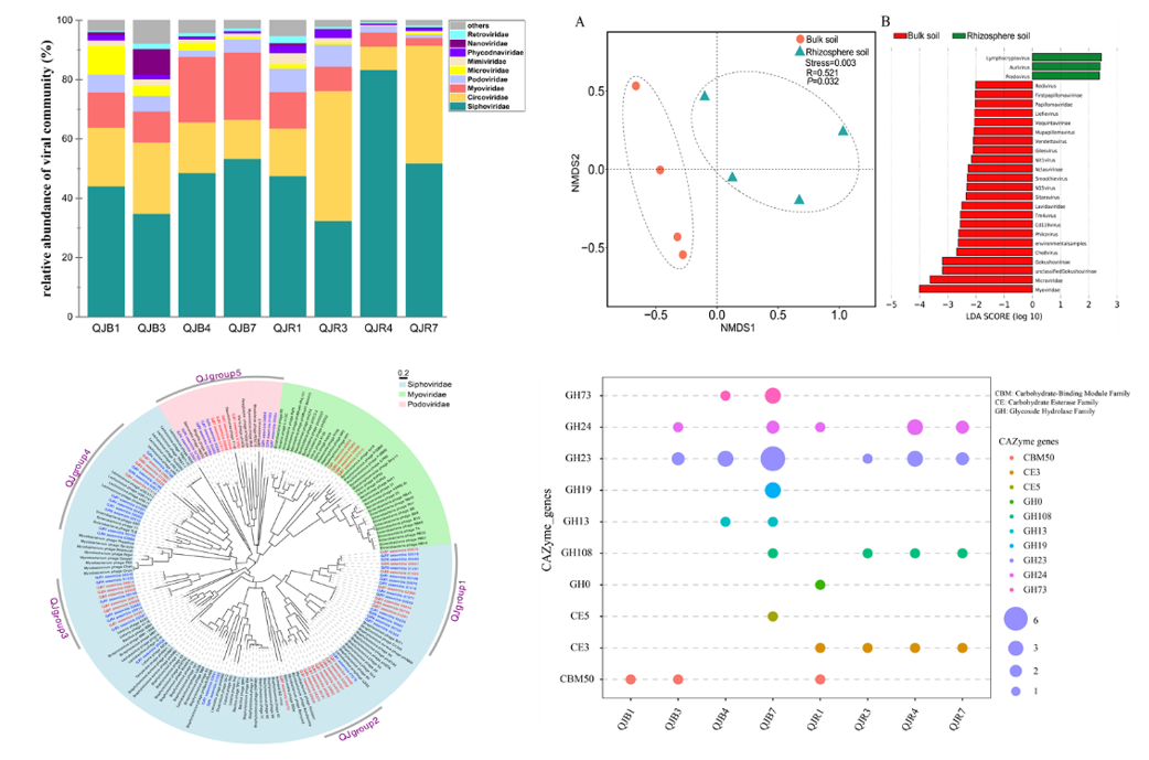 病毒是地球上数量最多、种类最丰富的生物实体。以往的研究表明,病毒在海洋环境中有着十分重要的生态功能,但目前土壤病毒生态学研究还处于初步发展阶段。课题组通过荧光显微计数和宏病毒组学的方法,结合生物信息学分析,探究了我国典型红壤地区玉米地不同施肥措施下根际与非根际土壤病毒的丰度、物种组成以及潜在的生态功能。结果表明土壤病毒丰度在玉米根际与非根际土壤之间没有显著差异。根际与非根际土壤病毒组共注释到57个病毒科,其中长尾噬菌体科相对丰度最高。有尾噬菌体目是农田土壤主要的病毒类群,通过其terL基因的系统发育分析发现,有尾噬菌体目在土壤中的多样性较高,含有3个新的病毒类群。不同施肥处理间病毒群落组成差异不显著,但根际与非根际之间病毒群落组成差异显著。进一步通过与dbCAN2数据库比对碳水化合物活性酶(CAZymes),共注释到48个CAZymes,分别属于3个CAZyme家族,包括碳水化合物结合模块、碳水化合物酯酶和糖苷水解酶,其中糖苷水解酶的丰度最高(图3)。病毒可能通过碳代谢相关基因的表达影响宿主碳代谢过程,从而影响农田生态系统中碳元素的生物地球化学循环。这一研究结果揭示了农田土壤病毒组相关特征,加深了我们对于植物-土壤-病毒系统相互作用的理解。以上结果发表于Environmental Microbiology (Bi et al., 2020)期刊上。