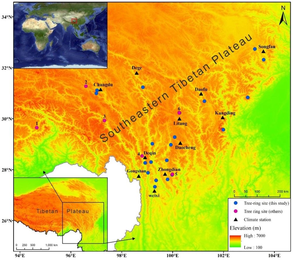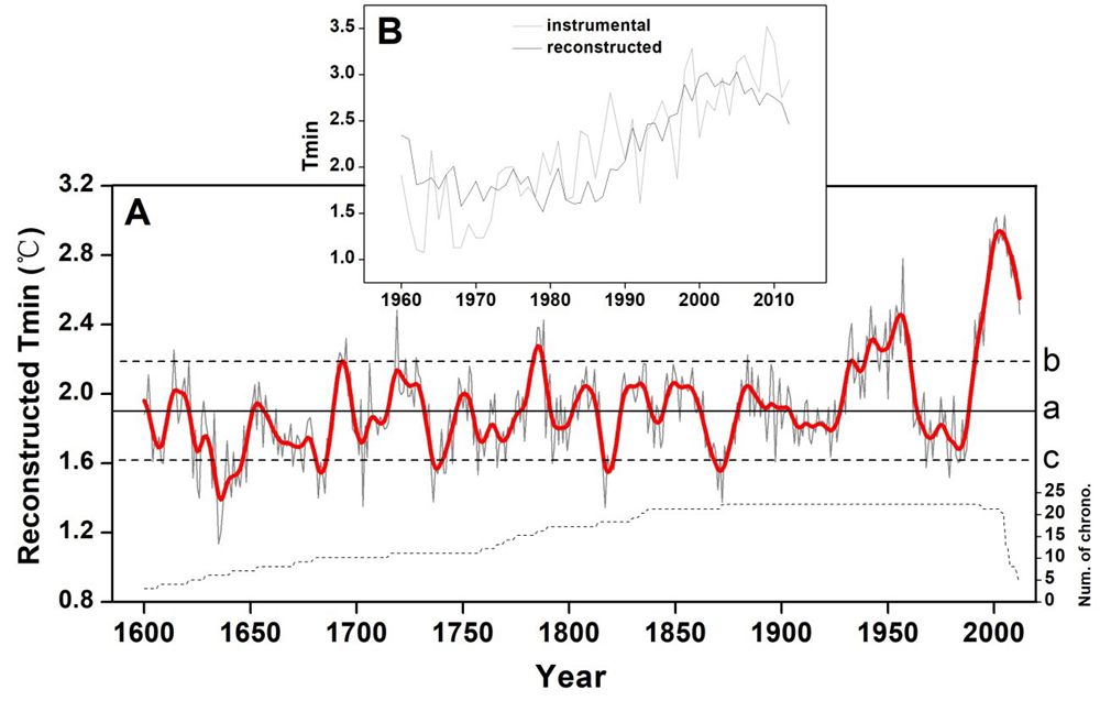 被誉为“亚洲水塔”的青藏高原是全球气候变化最敏感的区域之一,其气候以及生态环境变化与我国以及南亚地区国家生态安全直接相关。本研究以青藏高原东南部亚高山针叶林为研究对象,利用树木年轮学技术手段,大面积采集亚高山针叶林树木年轮样本,并结合国际树木年轮数据库提供的数据,建立由22条对温度敏感的树木年轮宽度年表,发现青藏高原东南部高海拔林线区域树木与气候变暖依然保持协同的生长趋势,成功描绘该地区的历史温度变化特征,并反演青藏高原东南部400多年(1600-2012年)年均最小温度历史变化。主要研究结果如下: