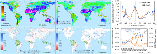 图1:全球表层土壤水数据的时空格局(2003~2018年);(a)全球表层土壤水数据的空间格局;(b)GLDAS表层土壤水空间格局;(c)表层土壤水随纬度的变化(-60°S~80°N)的对比;(d)表层土壤水分2003~2018年间年际趋势的空间分布;(e)GLEAM表层土壤水数据的年际趋势图;(f)本数据集与GLEAM数据的年际动态对比。在(a~b)中,红色圆圈表示本研究结果对比GLDAS数据在空间格局上有明显差异的地区,而在(d~e)中,红色圆圈表示表层土壤水减少的地区,蓝水圆圈是土壤水增加的地区。