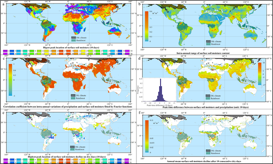图2:全球表层土壤水数据的年内变异及其与降水动态性的关系:(a)表层土壤水达到年内最大值的时间点(单位:10天);(b)表层土壤水的年内波动幅度;(c)表层土壤水与降水的年内波动的相关系数;(d)表层土壤水对降水峰值响应的时滞,单位:10天),左下方小插图为频率分布直方图;(e)在全球不同地区,当干旱事件(连续无有效降水的情况)发生在一年中第几个十天时,表层土壤水分下降最快;(f)若干旱事件随机发生在一年中任何一个时间段,连续10天无有效降水后土壤水的减少量。