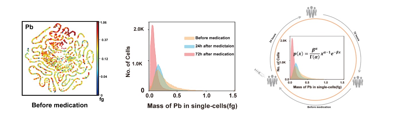 基于质谱流式细胞仪建立了单个红细胞中金属含量的检测方法,实现了铅中毒病人的单个红细胞中铅含量的相对定量。研究发现单个红细胞中铅的含量具有极大异质性,但其统计分布符合伽马分布,且不同病人、不同治疗阶段以及正常人群样本均符合该概率分布模型。单个细胞中铅含量分布的变化主要受红细胞中整体铅含量的影响,因此可以通过总体含量对单个细胞中铅的分布进行理论计算。另外,研究发现单个红细胞中铅含量随红细胞寿命增加而降低,同时网织红细胞中铅的含量高于成熟红细胞,这说明红细胞可能是骨铅转移到血液中的天然载体。本研究结果首次揭示了外源污染物在高等生物单个细胞水平的分布规律;其赋存和变化规律的发现为后续铅在人体内循环及相应促排手段的深入研究提供了基础。