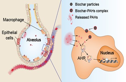 有机物是大气细颗粒的重要组成部分,流行病学及毒理学研究表明,颗粒物暴露导致的多种呼吸系统损伤与其负载的有机污染物的种类及含量紧密相关,然而颗粒物与有机物的复合毒性效应与作用机制尚未完全阐明,且少有研究关注颗粒物对有机污染物体内转化及毒性效应的影响。生物炭是大气细颗粒物的主要组分之一,是由生物质不完全燃烧产生的微纳米尺寸、高比表面积及多孔隙的颗粒物,且对于有机污染物具有非常强的吸附能力,具有高环境暴露和健康风险。该研究团队系统研究了以苯并(α)芘(B(α)P)等为代表的多环芳烃类有机污染物在生物炭颗粒物上的吸附/解吸附动力学特征,发现了生物炭颗粒对B(α)P的强吸附作用改变了二者分别的单一毒性效应,一方面颗粒物能够以“Trojan horse”(“特洛伊木马效应”)的方式运载B(a)P进入吞噬性细胞(如巨噬细胞),在细胞内部B(a)P进一步从颗粒物上释放出来,诱发相关毒性;另一方面,虽然相比于巨噬细胞颗粒物较难进入上皮细胞,但滞留于肺泡液体微环境中的颗粒物却扮演着“Reservoir”(“储存与释放体”)的角色,不断释放B(a)P,增加了对邻近上皮细胞的暴露风险,并激活胞内由芳香烃受体介导的损伤效应(图1)。相关工作发表于Environmental Science & Technology Letters。