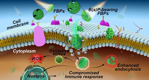 图2. 有机污染物负载致颗粒物与细胞膜的作用增强,增加颗粒物对巨噬细胞的毒性效应, 并且降低巨噬细胞的免疫反应效力。