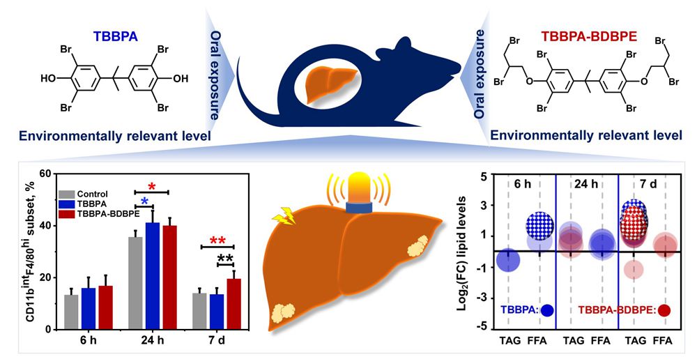本研究以小鼠作为模式动物,研究环境相关剂量的TBBPA与TBBPA-BDBPE经口暴露后对小鼠肝脏产生的影响。结果表明,TBBPA和TBBPA-BDBPE的暴露均可导致小鼠肝脏中CD11bintF4/80hi巨噬细胞增多;肝脏脂质成分的改变,尤其是甘油三酯的含量显著上升;基因转录的结果显示了调控脂质代谢和免疫的相关基因转录发生显著改变。对比单次暴露和多次重复暴露的结果发现,多次重复暴露导致的甘油三酯积累程度更强;TBBPA-BDBPE重复暴露7天后仍可引起肝脏巨噬细胞的增多,但TBBPA的重复暴露并没有引起该类细胞的显著变化。该研究明确了TBBPA类溴代阻燃剂在环境相关剂量暴露下可在小鼠体内造成肝脏的毒性效应,引起包括免疫细胞组成、脂质成分、基因表达发生显著改变。该研究结果提示了环境污染物在低剂量下的对肝脏的健康风险影响,应在未来的研究中予以重视。