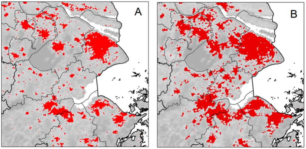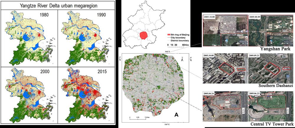 图1长三角城市群形成过程中的土地覆盖变化(左)2005-2009年北京五环内绿地的变化(右)