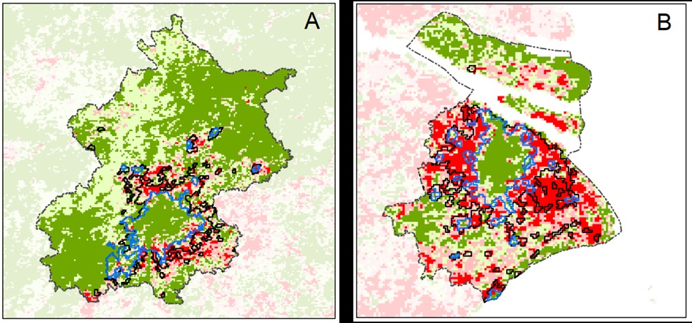 图3 2000-2015年北京和上海两市的EVI变化趋势分布(绿色为指数上升,红色为指数下降,蓝线为2000年城区边界,黑线为2015年城区边界)