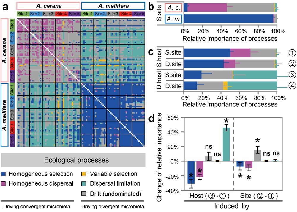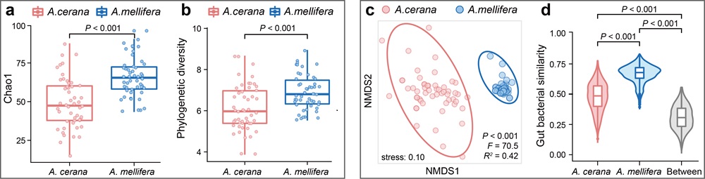 蜜蜂作为传粉者和产蜜者,具有重要的生态价值和经济价值。肠道菌群在维持宿主健康和环境适应性方面具有重要作用。但是,蜜蜂肠道菌群的大尺度空间分异规律及菌群构建的生态过程机制尚不清楚。该研究对我国1000公里范围内的两种蜜蜂(中蜂、意蜂)的肠道菌群进行了高通量测序分析,探究了蜜蜂肠道菌群的宿主格局和地理格局,区分了不同生态过程(均质选择、异化选择、均质扩散、扩散限制和随机漂变)在塑造这种格局上的相对作用。