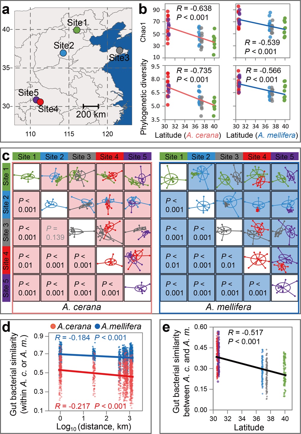 图2 中蜂(A. cerana)和意蜂(A. mellifera)肠道菌群的地理格局