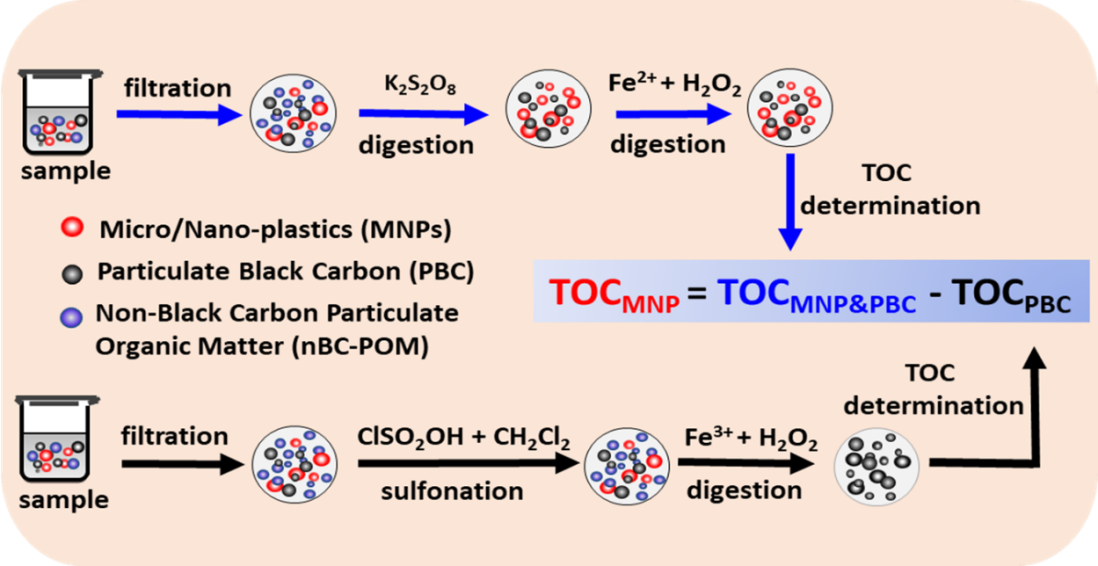 该测定方法流程如图1所示。首先,分别用不含碳的玻璃纤维膜过滤两个平行水样,富集微纳塑料及其他颗粒物。然后,将其中一张膜依次进行碱性K2S2O8氧化、芬顿消解处理以去除包括胡敏素在内的天然有机质,用TOC分析仪测定微纳塑料和颗粒态黑碳(PBC)的总TOC值;将另一张富集有颗粒物的玻璃纤维膜依次进行磺化、芬顿消解处理以去除PBC外其他颗粒态碳,用TOC分析仪测定PBC的TOC值。上述两个TOC值的差值即为微纳塑料的TOC。对1升水样进行处理测定,方法的检出限为7μg C/L。考虑到多数环境监测实验室、大学和科研院所已配备TOC分析仪,无需额外添置仪器设备即可实现微纳塑料总量的监测,方法具有成本低、可操作性强的优点;另外,由于该方法能同时定量样品中微纳塑料的TOC和颗粒态碳黑的TOC,有利于直接评估它们对碳循环的贡献。因此,该方法有望在微纳塑料环境污染监测及其对碳循环的影响研究中发挥重要作用。
