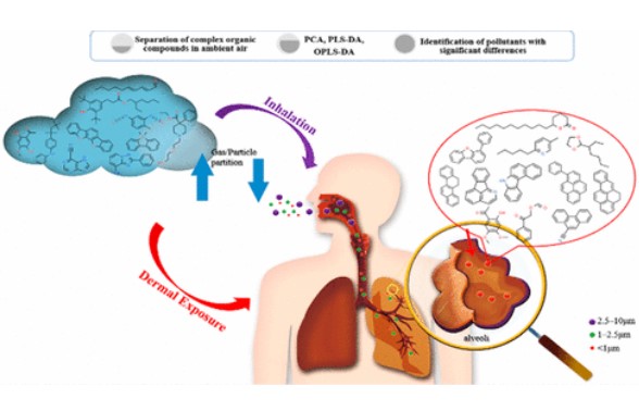 气固分配和粒径分布是影响大气中有机污染物环境行为和人体暴露风险的关键因素。课题组结合仪器分析与化学计量学手段,筛选出88个在气相和细颗粒物中具有显著性差异的有机组分,发现一些酚类化合物、硝基化合物和氰化物主要分布在气相,邻苯二甲酸酯、酰胺、芳香酮和氮杂环化合物倾向存在于颗粒相。将这些化合物的实测气固分配系数与基于热平衡分配模型计算的理论值进行比较,发现部分化合物相差多个数量级。进一步通过ICRP模型和皮肤渗透模型估算了这些污染物经呼吸吸入和皮肤接触的人体日暴露量,并根据这些物质在心脏损伤、肝毒性、呼吸毒性、致癌性、雄激素受体、雌激素受体、芳香烃受体和氧化应激方面的毒性效应数据进行了毒性评估,发现了大气中10种比常规监测的PAH具有更高健康风险的新污染物。