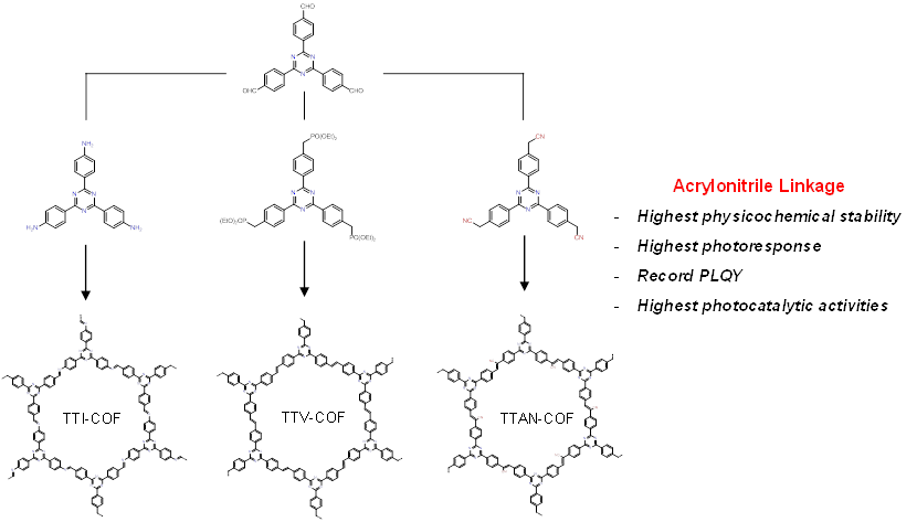 图1 亚胺连接TTI-COF、亚乙烯基连接TTV-COF和丙烯腈连接TTAN-COF的合成示意图及TTAN-COF的性能特点。