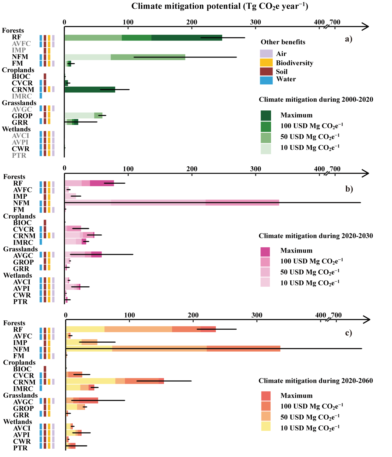 图1 中国NCS的历史缓解能力(2000-2020,a)和未来NCS潜力(2020-2030,b,2020-2060,c)。浅到暗色表示为每吨CO2e 10、50和100美元成本线以下可以实现的百分数。黑线表示95%的置信区间。与每个NCS路径相关的生态系统服务(空气、生物多样性、土壤和水)用彩色短条表示。路径名称:重新造林(RF)、避免森林转化(AVFC)、改良人工林管理(IMP)、天然林管理(NFM)、林火管理(FM)、生物炭(BIOC)、覆盖作物(CVCR)、农田养分管理(CRNM)、改良水稻栽培(IMRC)、避免草地转换。(AVGC)、放牧优化(GROP)、草地恢复(GRR)、避免沿海湿地影响(AVCI)、避免泥炭地影响(AVPI)、沿海湿地恢复(CWR)、泥炭地恢复(PTR)。