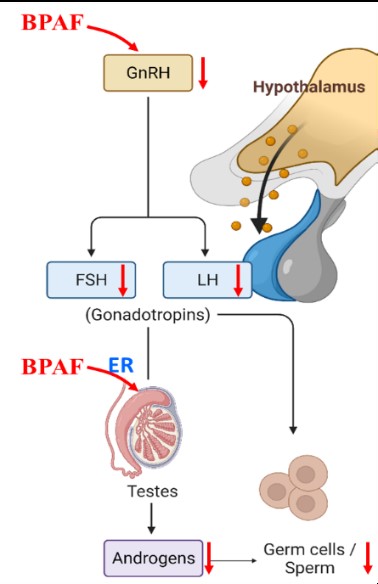 在对双酚AF(BPAF)的研究中发现,仔鼠从胎儿期暴露至出生后第9天即可检出生殖细胞和间质细胞减少、减数分裂抑制以及生精小管面积收缩;对应这些早期损伤,成年后的雄鼠表现出明显的睾丸发育不良特征。进一步研究揭示BPAF对睾丸发育的影响除对睾丸的直接作用外,同时有下丘脑参与(图1)。