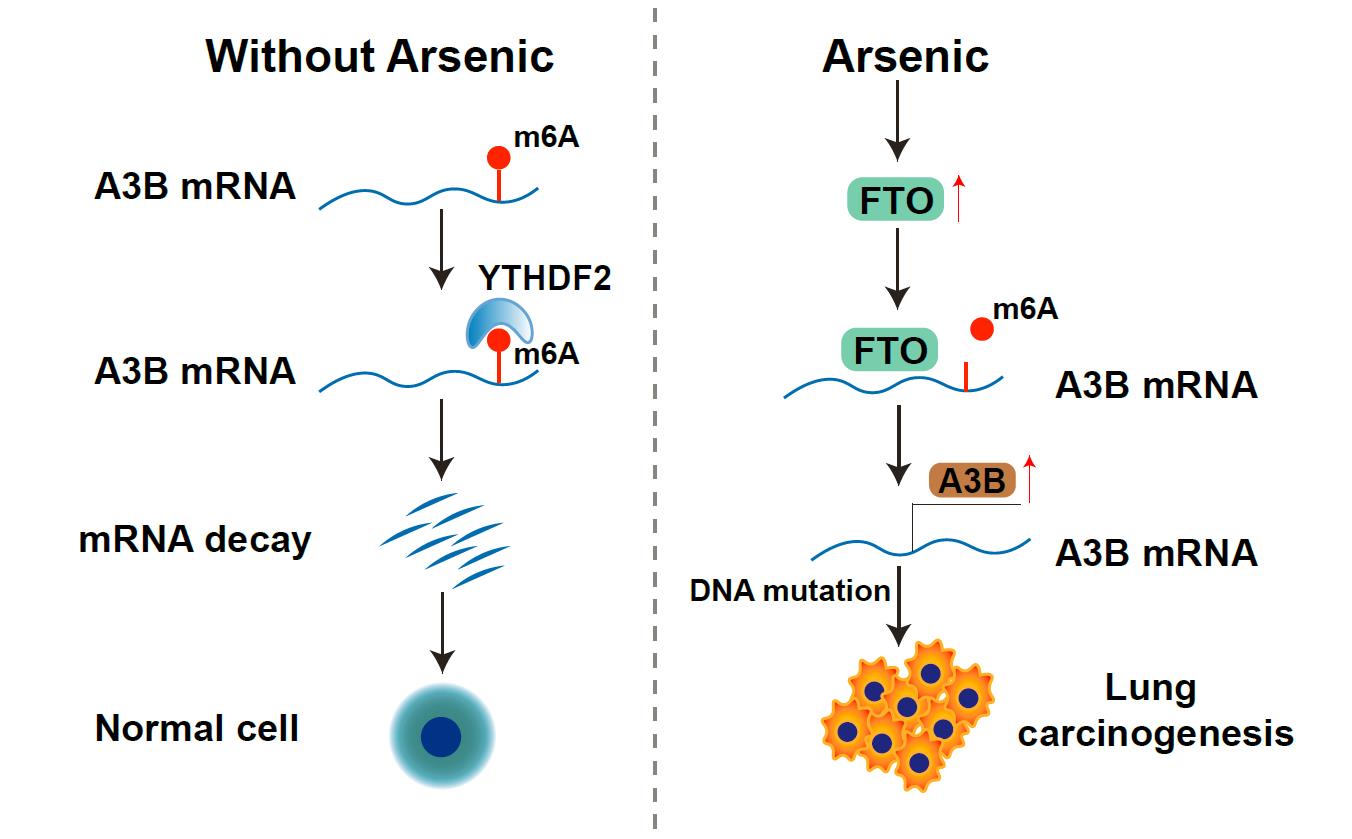 环境污染物砷的长期暴露可能导致癌症等相关疾病的发生,但目前人们对砷致癌的遗传和表观遗传毒性机制缺少深入认识。N6-methyladenosine(m6A)甲基化是真核生物RNA中含量最丰富的一种表观遗传修饰,在多种生理活动及疾病过程中发挥作用,但m6A修饰是否参与砷诱发的肺毒性尚不明确。课题组发现低剂量砷暴露下,肺脏细胞中胞嘧啶脱氨酶APOBEC3B的蛋白而非RNA水平表达显著上调,并且APOBEC3B介导了砷导致的肺细胞G/C到A/T突变增加。分子机制研究发现砷暴露下m6A去甲基化酶FTO的表达上调,它能通过去除APOBEC3B的CDS区域的m6A修饰促进APOBEC3B表达。另外甲基化阅读蛋白YTHDF2识别甲基化的APOBEC3B,与FTO协同调控砷暴露下APOBEC3B的mRNA稳定性,进而促进其表达水平以及DNA突变概率。最后通过人非小细胞肺癌组织芯片染色课题组发现肿瘤组织中FTO与A3B的高表达且显著正相关。该研究阐明m6A修饰在砷的人肺上皮细胞毒性效应中的作用及机制,可能为相关疾病的预警提供新的思路。