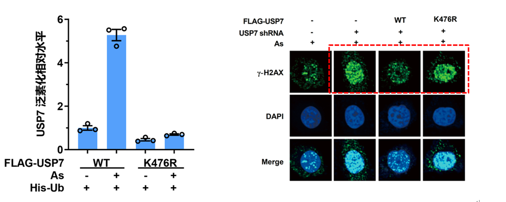 课题组同时发现低剂量砷可能通过促进氧化应激和DNA损伤影响肝癌的进展。去泛素化酶USP7在一系列癌症类型的肿瘤发生和治疗抗性中具有关键作用,但在污染物致癌性中的作用及机制仍不清楚。通过高通量定量质谱和蛋白组学研究,课题组发现砷暴露下USP7蛋白存在泛素化修饰并介导了USP7的活化。USP7活化后与其靶分子血红素加氧酶-1(HO-1)的结合增加,进而抑制HO-1蛋白的泛素化降解反应,从而降低砷诱发的氧化应激和DNA损伤;裸鼠成瘤实验发现USP7/HO-1通路活化对肝脏肿瘤的生长至关重要,同样通过肝癌组织芯片课题组进一步证实USP7和HO-1在肝癌组织中高表达且呈正相关性。该研究揭示了低剂量砷暴露下USP7/HO-1通路激活的分子机制,为砷暴露与肝癌发病的相关性提供新的理论依据。