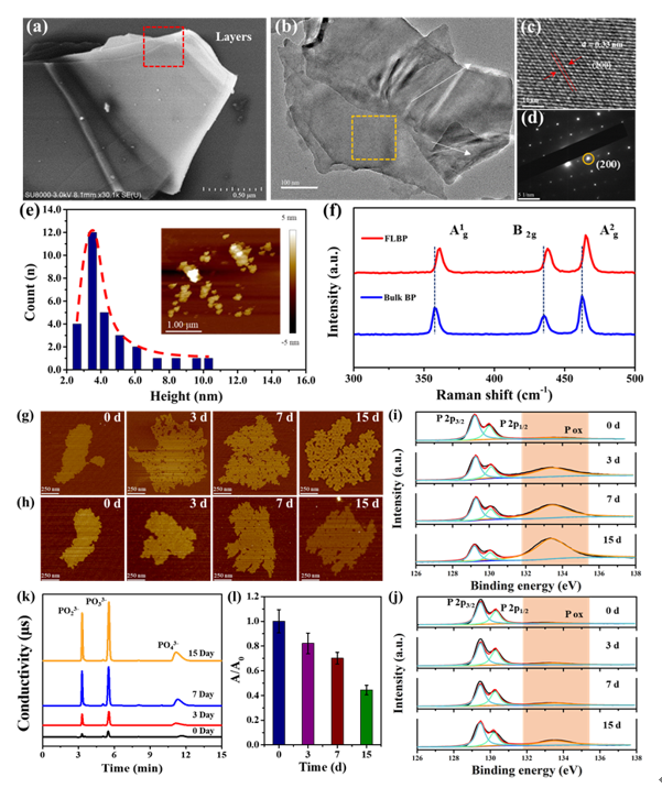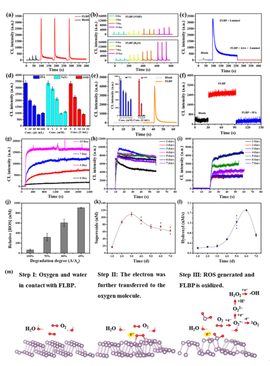 基于此,研究者合成了黑磷纳米片,系统研究了其黑暗条件下氧化降解的过程。在此过程中意外地发现即使在没有光照的情况下,黑磷纳米片的自降解也伴随着活性氧的持续产生。且随着贮存时间的延长,黑磷纳米片降解及其活性氧生成的程度越高。