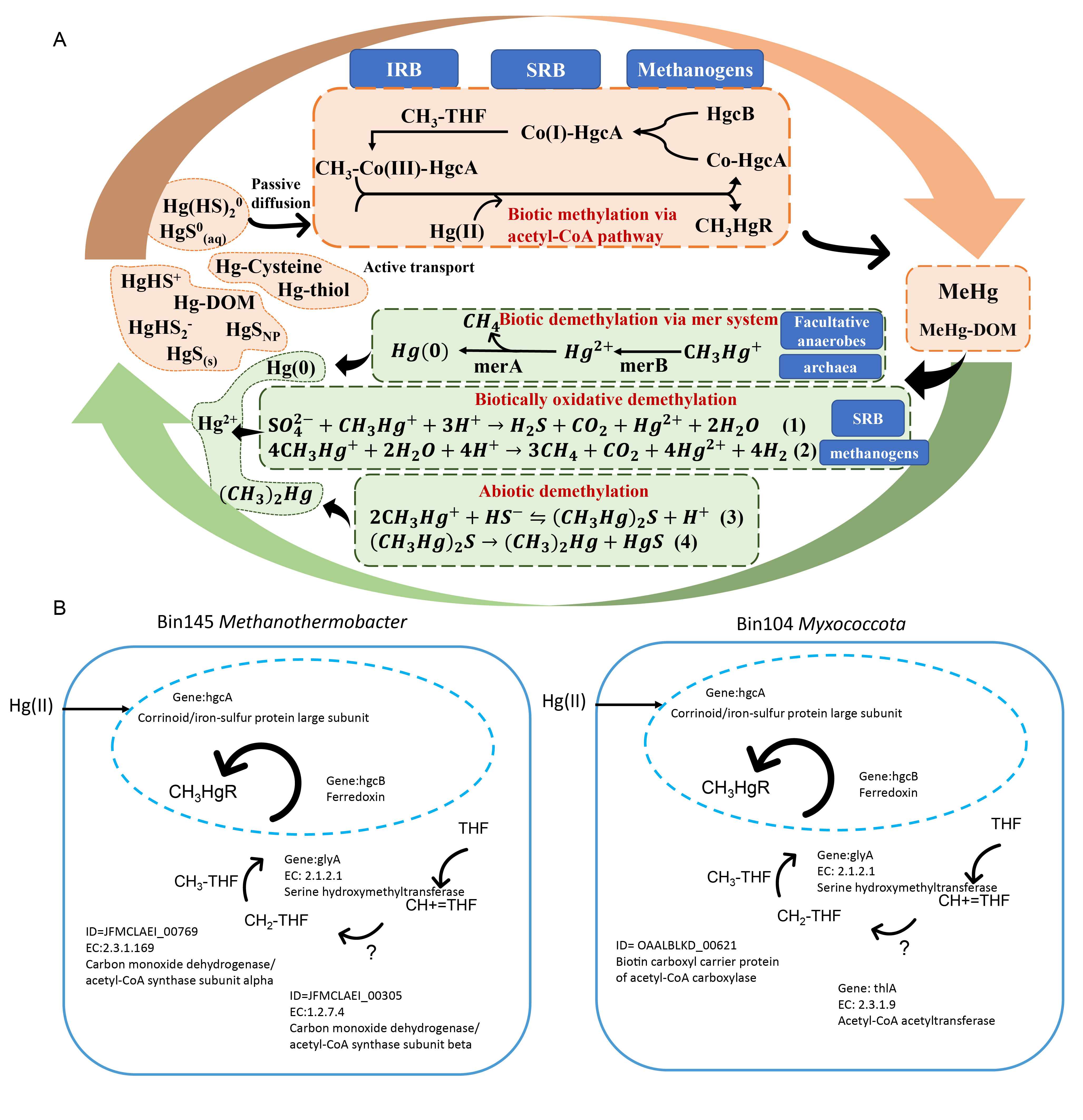 宏基因组分析发现,在好氧堆肥初期(1~4天),由于可微生物利用有机物丰富、堆体孔隙度较低、耗氧速率快以及氧传质受限,一些携带汞甲基化基因(hgcA基因)的典型厌氧微生物(硫酸盐还原菌,Desulfobacterota 和古菌,Euryarchaeota)具有较高丰度。随好氧堆肥进行,hgcA基因丰度降低。经过重组的151个微生物基因组(metagenome-assembled genomes, MAGs)中,只有3个微生物基因组(Myxococcales,Firmicutes,Methanothermobacter)同时携带hgcA和hgcB基因。尽管这3个微生物基因组属于不同微生物,却具有相近的微生物代谢路径,特别是具有与硫代谢和产甲烷代谢相关的路径。与二价汞(Hg(II))微生物还原生成零价汞(Hg(0))有关的merA基因(甲基汞的微生物去甲基化过程)广泛存在于微生物的基因组中,这表明污泥堆肥具有广泛的使Hg(II)还原生成Hg(0)而导致汞随气体散失的功能微生物。