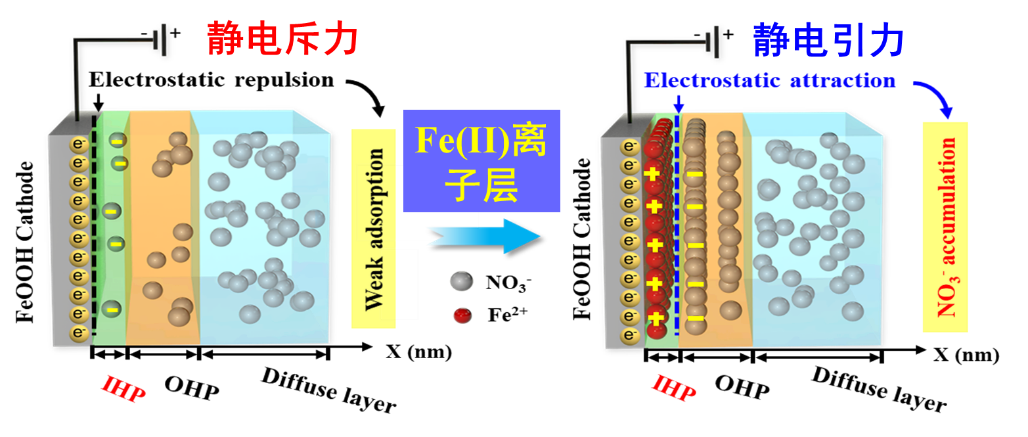 在上述研究的基础上,课题组充分发挥Fe的电子供体能力,提出了基于电子传递的原位界面调控策略。以自然界广泛存在FeOOH作为Fe的“源”,利用电的作用原位生成Fe(II)离子层,采用荧光显微镜证明了吸附态Fe(II)的存在,分子动力学模拟证明了界面硝酸根离子发生了聚集效应,并证实其以特异性吸附阳离子的方式位于内亥姆霍兹层。该方法有效减弱了界面静电斥力,强化了硝酸根离子的界面聚集效应,显著提高了界面电子传递速率,进而极大提高了硝酸盐的还原效率,是迄今为止最高的铵产率达成方法之一。成果以“Specifically adsorbed ferrous ions modulate interfacial affinity for high-rate ammonia electrosynthesis from nitrate in neutral media”为题、以直接投稿的方式,发表于美国科学院院刊PNAS 2022。