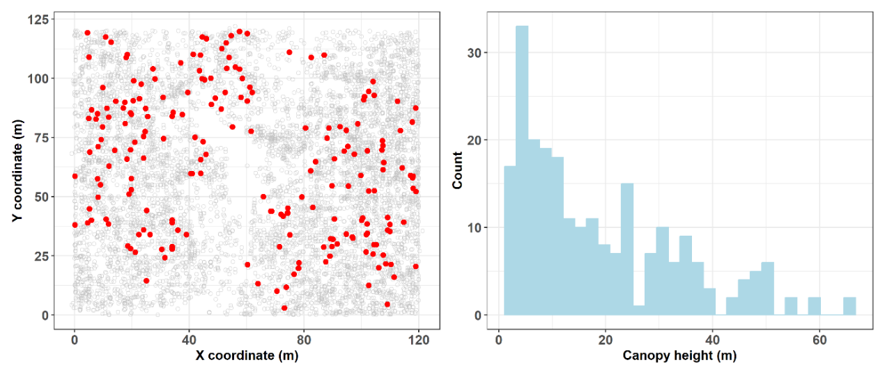 图1 补蚌塔吊样地树种取样分布点和取样乔木个体的高度分布(红色点为采样个体,灰色点为塔吊范围内的其他个体)