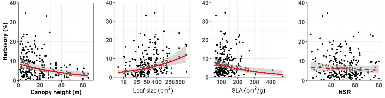 图2 树冠高度、叶片大小、比叶面积和邻居物种丰富度(NSR)与植食率的关系