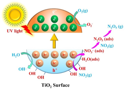 图1. TiO2表面NO2非均相光氧化形成N2O5示意图