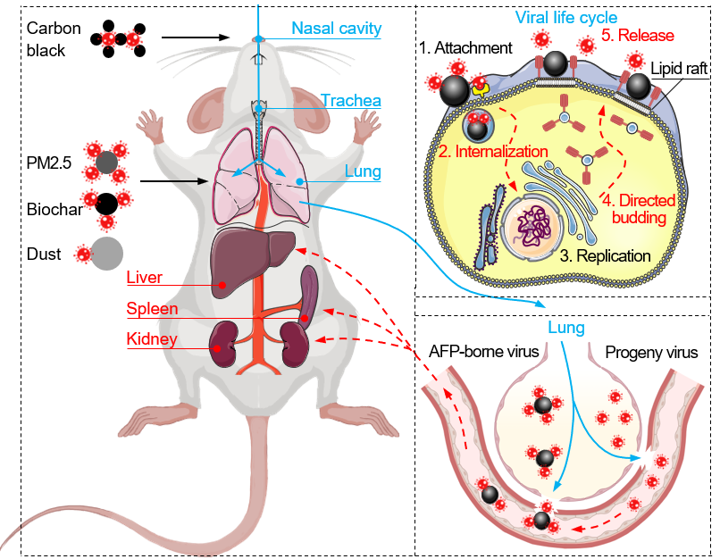针对上述科学问题,研究团队发现大气细颗粒物与流感病毒存在活跃的相互作用,发现颗粒物负载的病毒仍具有强感染活性,并且颗粒物的理化性质(例如亲疏水特性等)是影响病毒负载量和感染过程的重要因素。在流感病毒感染早期,颗粒物通过网格蛋白介导的内吞作用(clathrin-mediated endocytosis)等途径,促进病毒以非唾液酸受体依赖的方式进入宿主细胞;而在感染后期,颗粒物与脂筏结构域(lipid raft domains)相互作用促进子代病毒从细胞膜出芽释放,这些结果揭示了颗粒物促进流感病毒内吞和出芽释放的机制。动物感染实验进一步发现,颗粒物显著改变了流感病毒在呼吸道的分布,在感染早期,亲水性强的颗粒物快速地运载病毒进入肺部,而疏水性强的颗粒物则将病毒阻滞在鼻腔中。更为重要的是,颗粒物可以运载病毒突破气血屏障,到达肺外器官(例如肝脏、脾脏和肾脏),并导致更严重的损伤结局,包括全身性炎症、局部组织损伤和体重减轻等。核心发现如下示意图所示。该研究工作对于深入了解大气细颗粒物等环境因素对病原微生物传播和感染的影响具有启发意义。