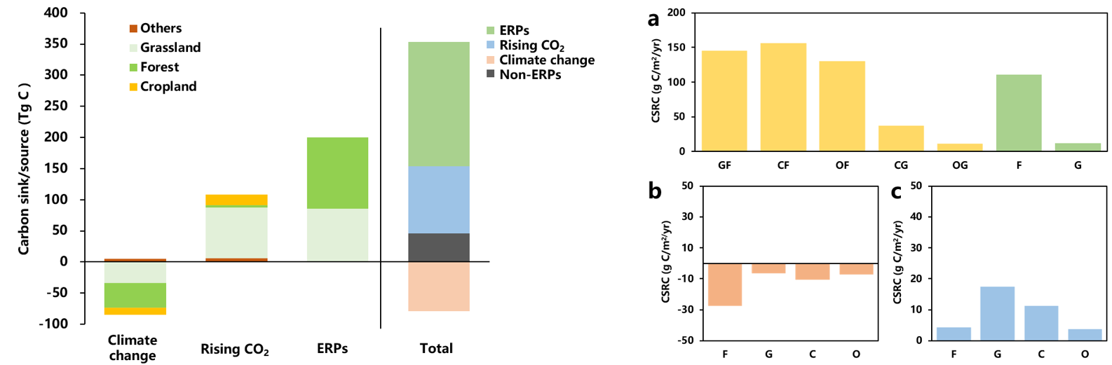 图1 左) 气候变化、大气CO2浓度升高和生态工程对碳汇的影响;右) 气候变化、大气CO2浓度升高和生态工程对不同土地利用类型固碳速率的影响